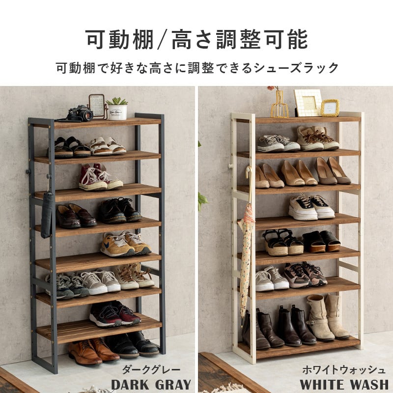 - 【組立式】シューズラック オープンタイプ 約24足収納 可動棚7段 フック付き インテリア 2色展開 幅65cm